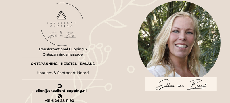 "Ik ben Ellen van Beest, woonachtig in Haarlem-Noord samen met mijn man en twee zoons. Na jarenlang werkzaam te zijn geweest in de commerciële sector als Retail Manager en Recruitment Specialist, besloot ik mijn carrière een nieuwe richting te geven. Mijn passie voor de gezondheid van de mens en mijn verlangen om anderen te helpen zich beter te voelen, leidde mij uiteindelijk naar Transformational Cupping & Ontspanningsmassages.